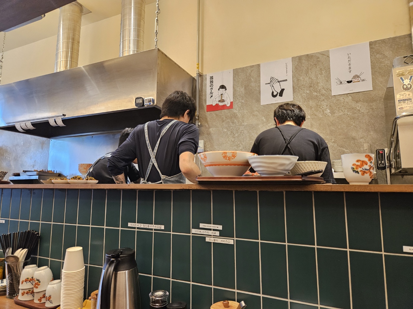 가게는 생각보다 작았고 테이블이 아닌 닷지 형식으로 되어 있습니다. 테이블이 아닌 닷지에서 식사를 하니 먼가 더 맛이 있고 요리에 집중할 수 있어서 좋았던 것 같습니다. 주문은 문 바로 앞 키오스크에서 하시면 됩니다. 저희가 갔을 땐 이미 만석이라서 키오스크에서 나온 영수증에 직원분이 숫자를 적어 주셨고, 나중에 자리가 나면 순차적으로 숫자를 불러주셨습니다.