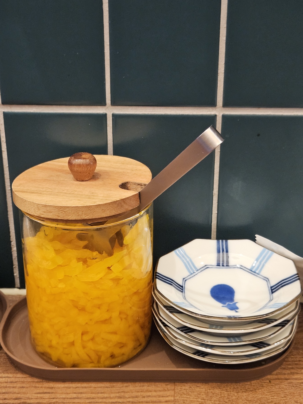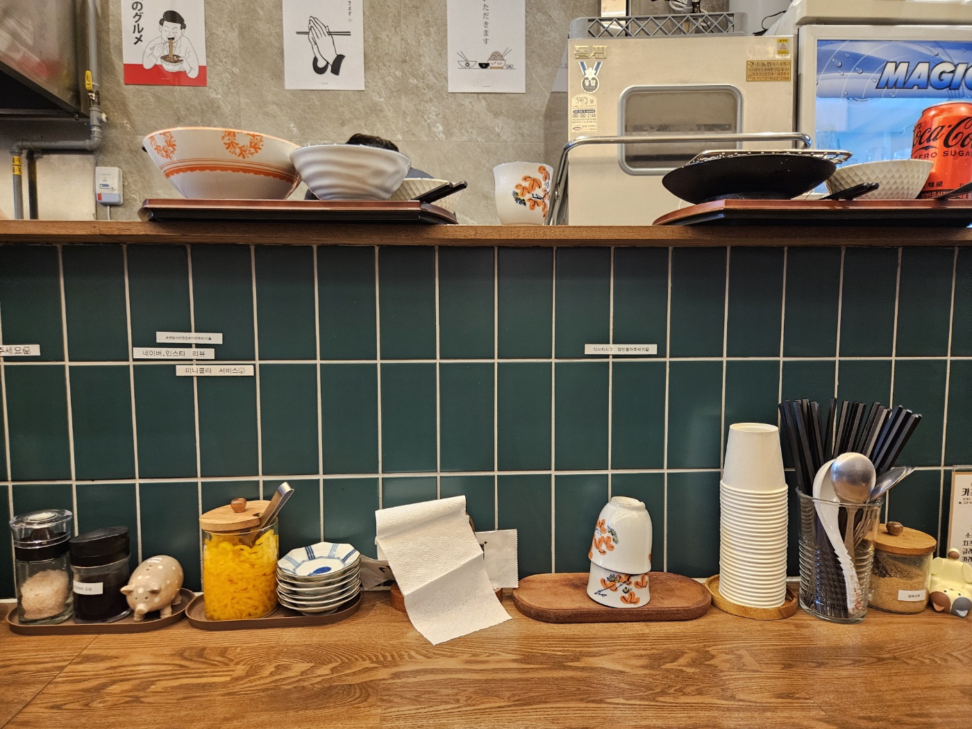 자리에 앉으니 단무지부터 각종 식기류가 놓여 있었습니다. 그리고 위에 식기류가 놓여있는 걸 보니, 식사가 끝난 뒤 닷지 위에 놔두는 것 같습니다.